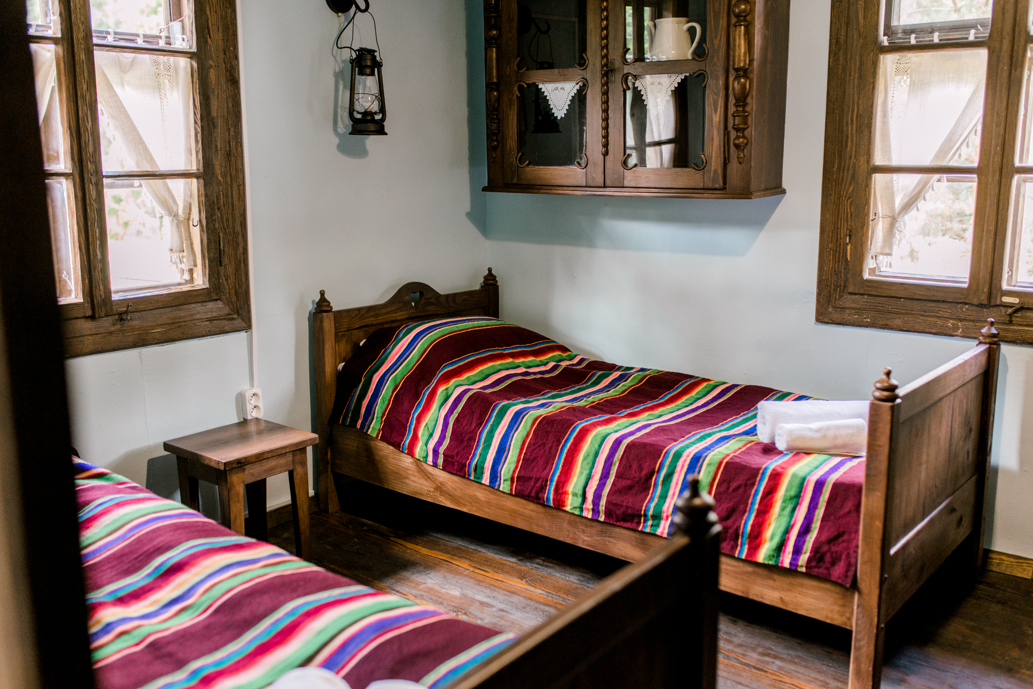 Ten przestronny pokój czteroosobowy podzielony jest ścianką na dwie części, z dwoma wygodnymi łóżkami pojedynczymi w każdej, co zapewnia dodatkową prywatność dla gości. Wyposażony w klimatyzację, pokój utrzymany jest w przytulnym, wiejskim stylu z drewnianymi akcentami i jasnymi wnętrzami. Goście mają dostęp do wspólnej, dużej kuchni z pełnym wyposażeniem – lodówką, kuchenką, czajnikiem i stołem jadalnym – oraz do łazienki z prysznicem i wszystkimi niezbędnymi udogodnieniami, dzielonymi z gośćmi z pokoju nr 1. Pokój nr 1 i 2 mają wspólne wejście do chaty z zewnątrz.